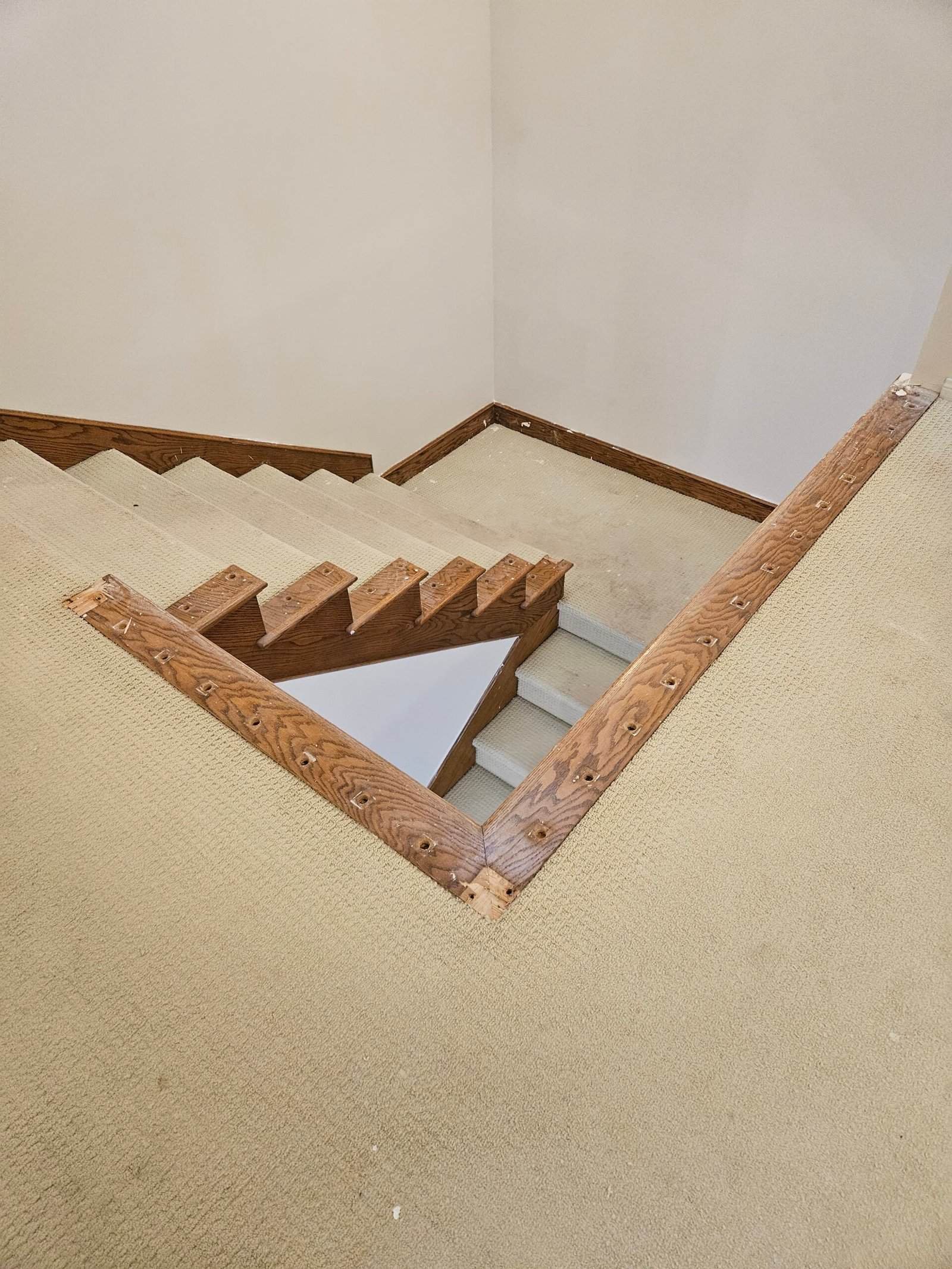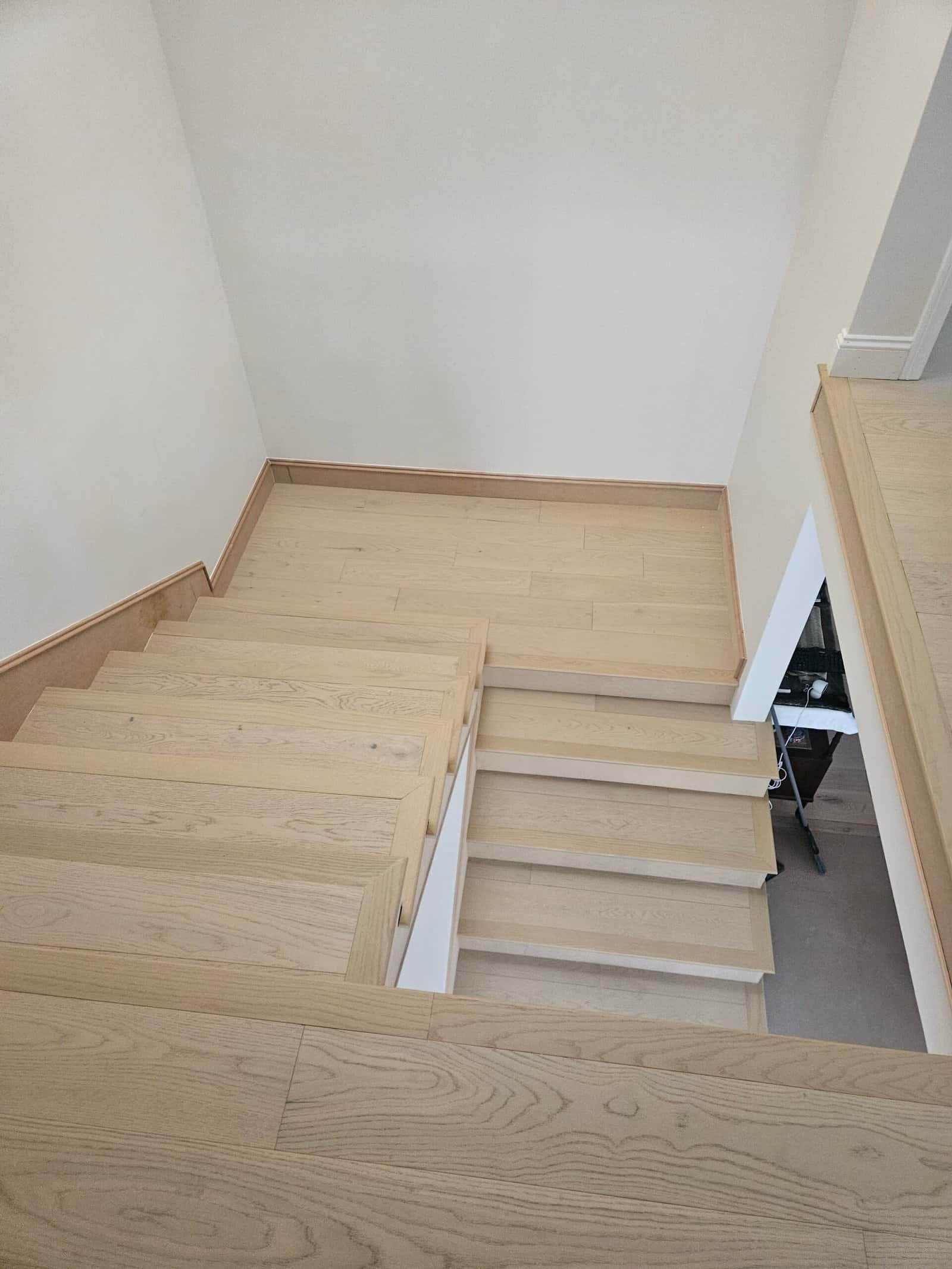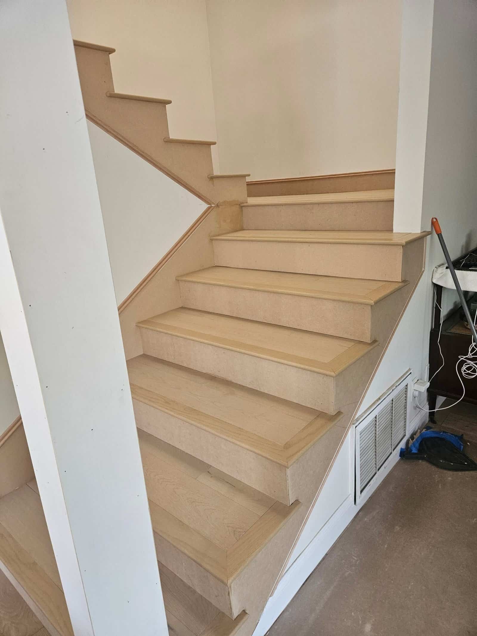 Natural light-colored hardwood staircase with detailed trim work, showcasing professional installation and quality craftsmanship.