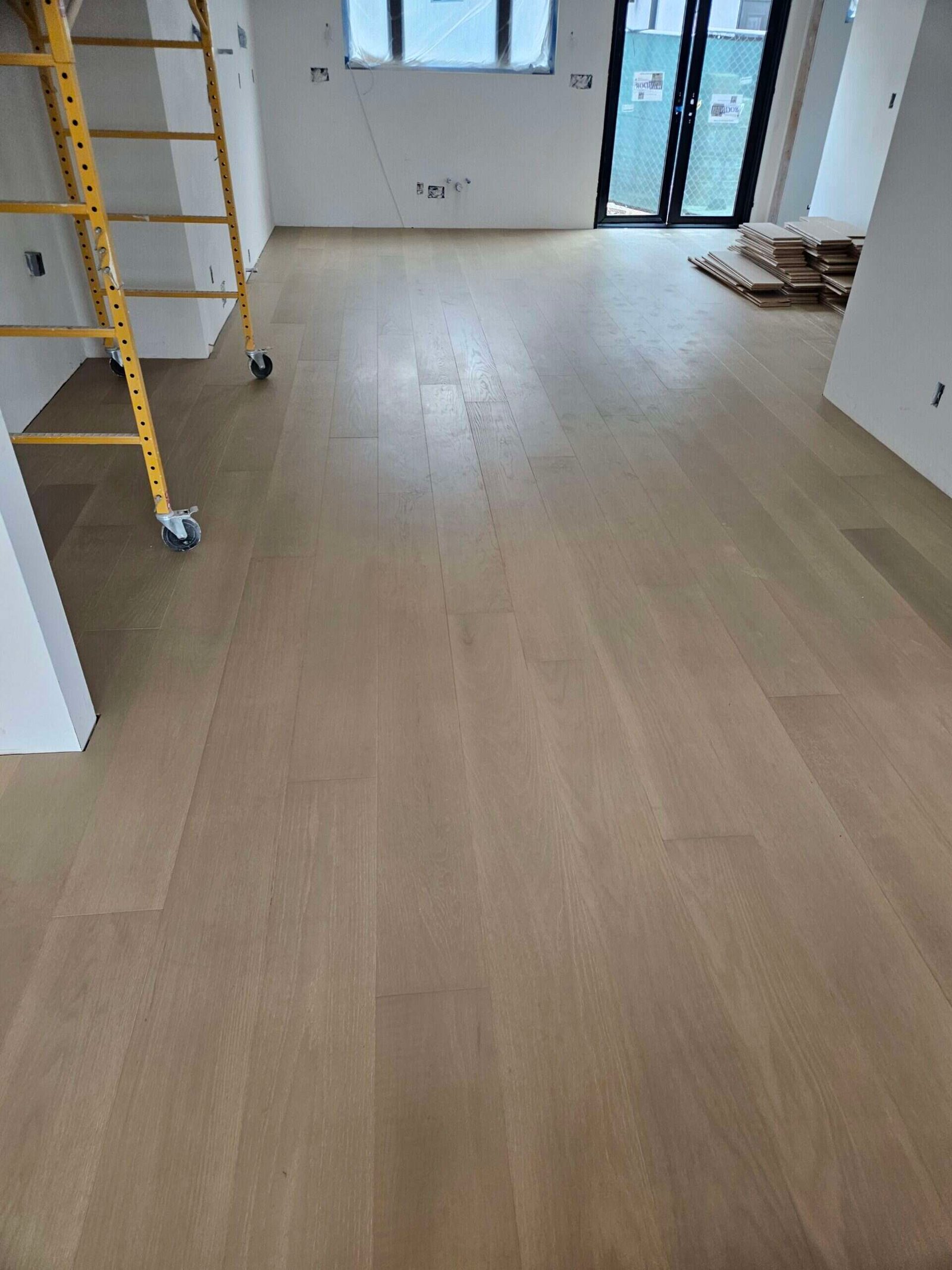 Natural oak hardwood flooring in a bright living room with large glass doors and a balcony.